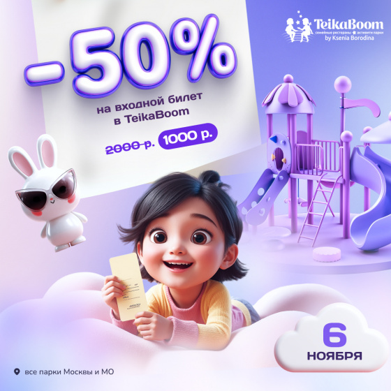 Только 6 ноября- грандиозная скидка 50% на входные билеты в TeikaBoom. Погрузитесь в мир увлекательных развлечений и незабываемых впечатлений всего за 1000 рублей вместо обычных 2000 рублей! Не упустите возможность подарить своим детям яркие эмоции по специальной цене!